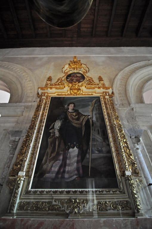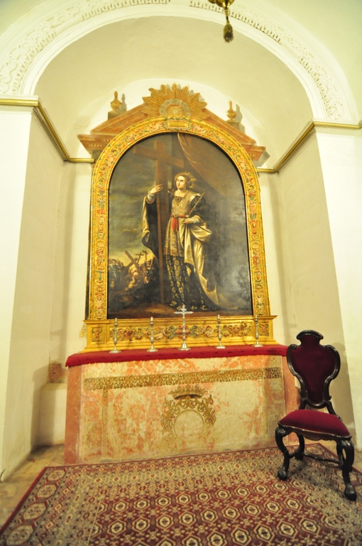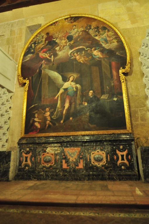 Dentro, el altar se encuentra presidido por un enorme cuadro en el que se representa a San Eulogio, natural de Córdoba, de ahí el nombre actual de la capilla. La pintura, fechada por los expertos en torno a 1630, es obra de Vicente Carducho. En él, un ángel le entrega la palma y la corona del martirio, además de aparecer los atributos propios de San Eulogio como son la capa, el báculo49 y la mitra50. Habiendo sido nombrado arzobispo de Toledo, no llegaría a desempeñar esta función, pues el emir Muhammad I ordenó que fuera torturado hasta morir, algo que se llevó a cabo el 11 de marzo del año 859, día en que fue degollado en la orilla izquierda del Guadalquivir, cerca de la Mezquita.