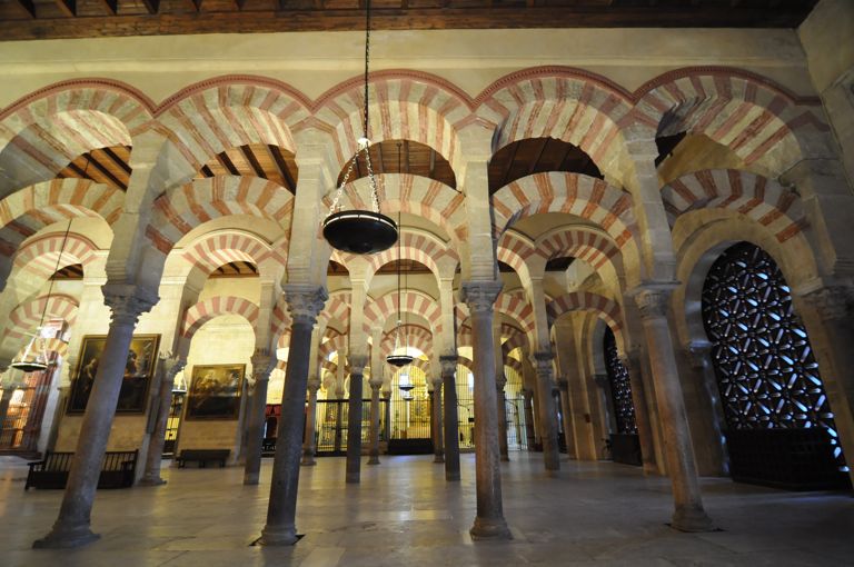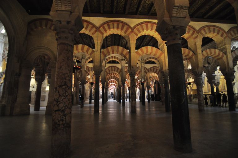 Una vez dentro del edificio, nos puede sorprender las dimensiones de este enorme bosque de columnas, habiendo sido necesarias un total de 142 de ellas para la construcción original. Existe una gran disparidad de ellas, así como de sus capiteles y basas, dado que la mayoría están tomadas de anteriores construcciones romanas y visigodas de la ciudad de Córdoba. Aunque la mayoría de las basas son visibles en la actualidad sobre el pavimento de piedra, en el momento de su construcción podían quedar cubiertas por el suelo original, formado éste por un recubrimiento de argamasa de cal que se extendía sobre tierra compactada.