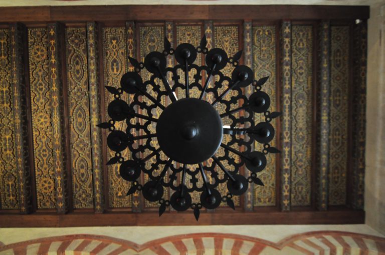 En el siglo XVIII y ante el temor de un posible incendio, se sustituyeron los techos originales por bóvedas encamonadas31. A principios del siglo XX, en 1919, el arquitecto Ricardo Velázquez Bosco (Burgos, 1843 - Madrid, 1923), en colaboración con el escultor Mateo Inurria (Córdoba, 1867 - Madrid, 1924), realizó una reconstrucción de ellos que podemos contemplar en la nave central, por la cual que hemos entrado. Se trata de una ornamentación en la que se suceden diferentes cintas y lazos de distintos colores (negro, oro, rojo y verde).