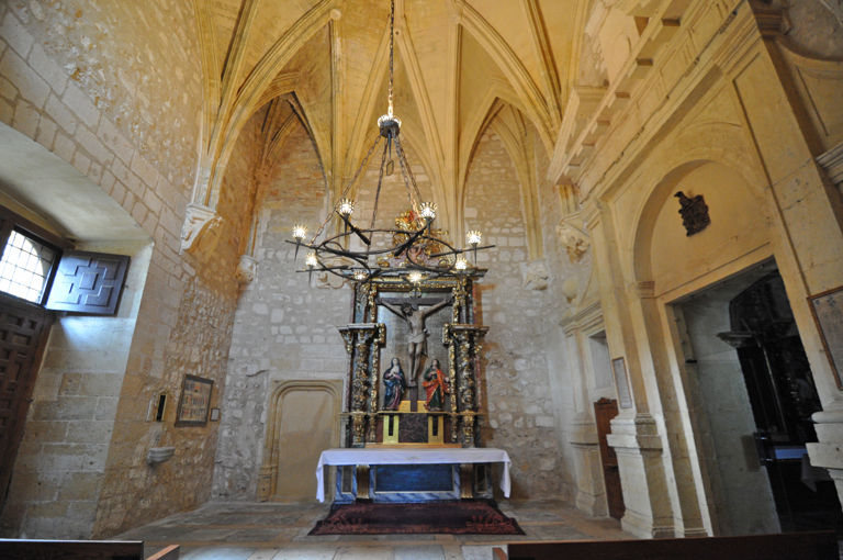 A la izquierda del retablo, podemos ver, también en la primera fotografía de la capilla, un arco tapiado. Data del siglo XV y se trataba de la puerta por la que se accedía a la escalera que unía la capilla con el Convento de Santa Cruz la Real. Esta escalera era iluminada por un vano que hoy se encuentra tras el retablo