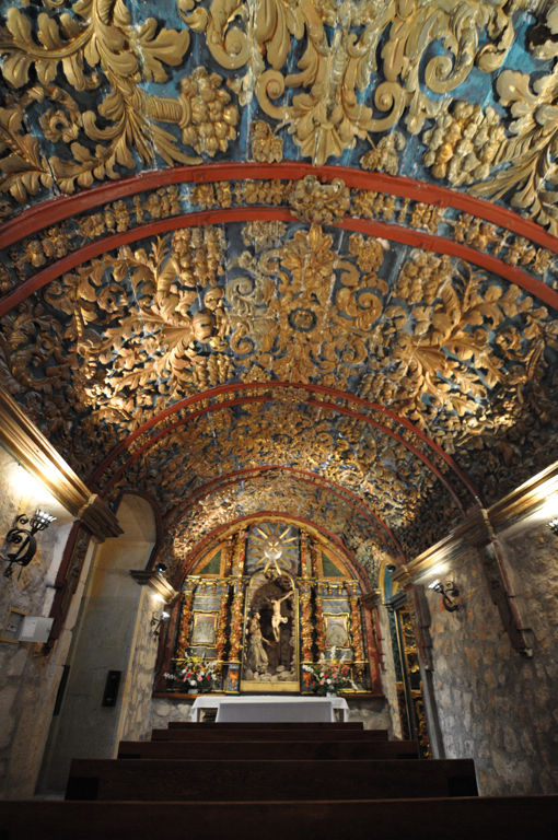 Atravesamos la puerta clasicista y estaremos en la Cueva de Santo Domingo, una capilla interior de planta rectangular de 9,80 por 4,20 metros. Con una altura menor que la Capilla de los Reyes Católicos, la Cueva está cubierta por una bóveda de medio cañón14 recubierta con una armadura15 de madera dorada y policromada de estilo churrigueresco16. Originariamente, las paredes estaban revestidas, hasta una altura de poco más de un metro, con azulejos de Talavera de la Reina (Toledo), los cuales desaparecieron tras una reforma llevada a cabo a comienzos de la década de los 80 del pasado siglo XX.