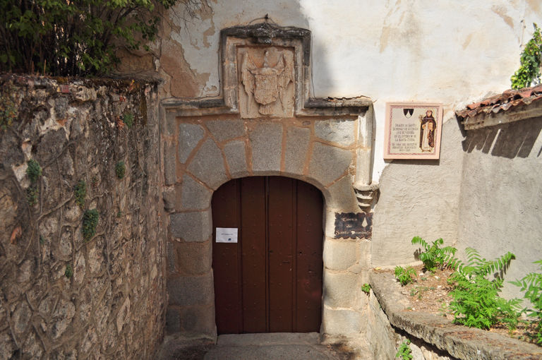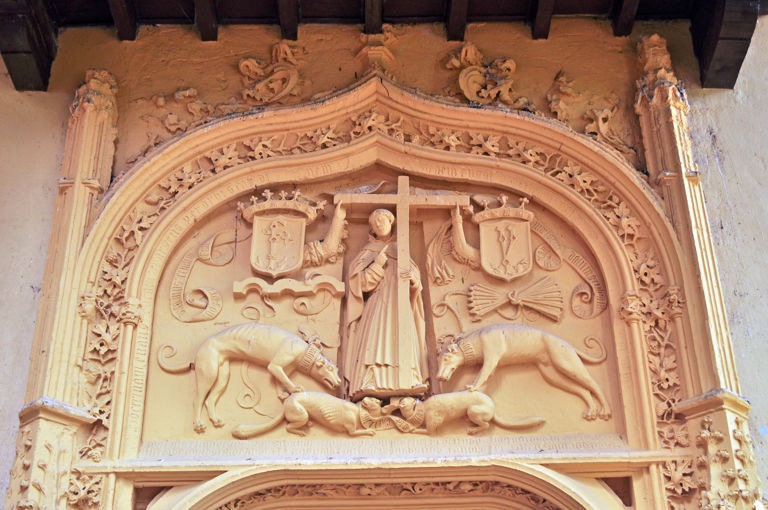Al otro lado del Jardín, veremos la Portada del Santuario, protegida por un tejado de madera. Esta bellísima entrada merece toda nuestra atención antes de entrar en el templo. El pórtico, de estilo gótico isabelino2, cuenta, en su parte superior y enmarcado en un arco conopial5, con un medio relieve en cuyo centro está representado Santo Domingo de Guzmán con una cruz cogida con la mano izquierda, mientras que pisa a dos raposas8 (iconografía de la herejía9). Éstas están sujetas por dos perros, símbolo de fidelidad de los guardianes de la Iglesia y el Evangelio. Sus collares llevan escrita la palabra "Inquisitio" y bajo las raposas se puede leer la inscripción "Haeretica Pravitas".