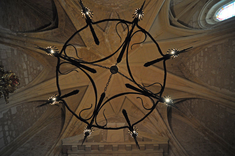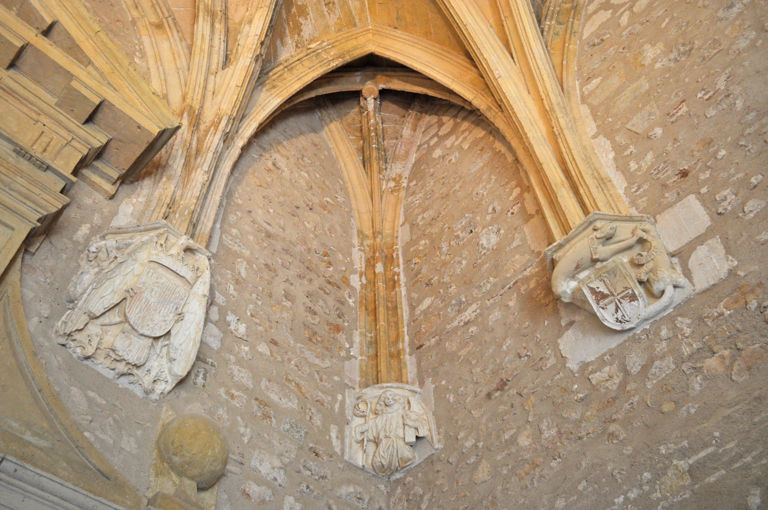 En cada una de las cuatro esquinas, hay a su vez unas pequeñas bóvedas, mientras que los nervios11 están sostenidos por ménsulas12 en las que están representados, de manera alterna, escudos de los Reyes Católicos, ángeles que sujetan los símbolos de los monarcas del yugo y las flechas, y escudos de los dominicos. Esto refleja, una vez más, el apoyo de los monarcas a dicha orden religiosa.