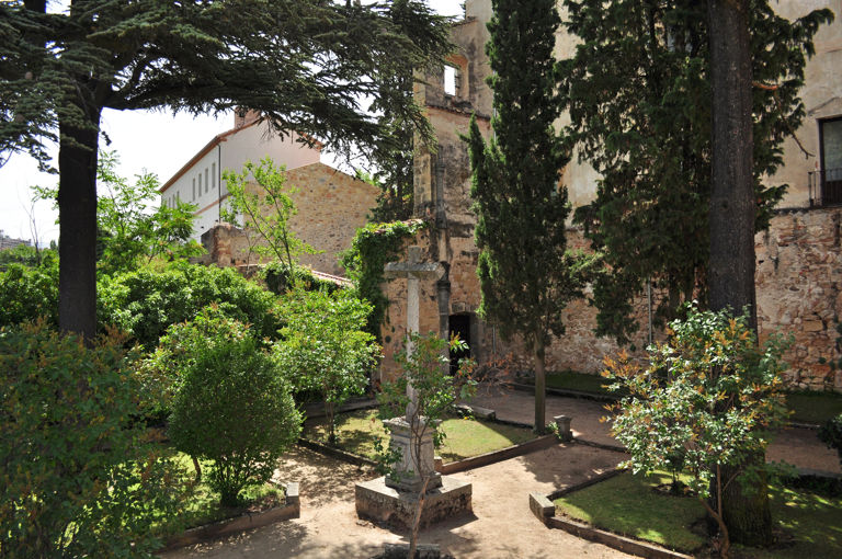 Traspasamos la Puerta y nos da la bienvenida un recoleto Jardín. Este espacio, de planta cuadrada, se ubica entre uno de los muros del antiguo Convento de Santa Cruz y que linda con la Cueva, otra pared revestida de un profuso follaje y un muro con un banco de piedra en el que un mirador nos deja unas hermosas vistas sobre el río Eresma. Cuatro cuartos de césped y árboles en las esquinas forman un cuadrado en el que sendos caminos llevan hasta una cruz de granito situada en el centro y en la que figuran, en los cuatro laterales de su pedestal, el escudo de la Orden Dominica.