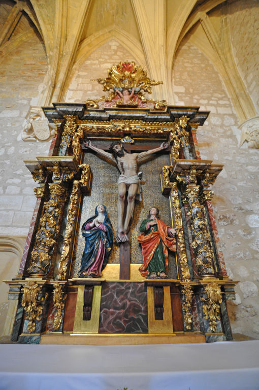 Presidiendo la capilla hay un retablo barroco realizado en madera policromada que acoge en su centro un Calvario del siglo XVI y de autor desconocido hasta la fecha (enero de 2013). Años atrás, éste se encontraba situado frente a la entrada a la capilla, pudiéndose acceder a la Cueva por dos puertas que había a ambos lados de él. Cuando se cambió a su ubicación actual, dejó a la vista la portada del siglo XVII que podemos ver hoy día y de la que aparece parte a la derecha de la fotografía general de la capilla. De claro estilo clasicista y rematada por un frontón13 triangular partido, su realización está atribuida a Pedro de Brizuela, quien por entonces llevó a cabo algunas obras en el convento.