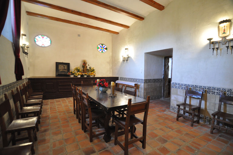 Finalmente, aún veremos una estancia más antes de marcharnos. Regresamos a la Capilla de los Reyes Católicos y, en el muro opuesto al del retablo, se abre una puerta que da acceso a la Sacristía. Se trata de una habitación que cuenta con las mismas dimensiones que la Cueva (9,80 por 4,20 metros) y que, en ocasiones, sirve como sala para reuniones. Las paredes se recubren hasta media altura con un zócalo17 de azulejos. En el extremo derecho, según entramos, hay un antiguo mueble de madera sobre el que se dispone una talla de la Virgen con el Niño y un cuadro con la imagen de Santo Domingo, mientras que en la pared izquierda, hay una pila19 de piedra; el centro está ocupado por una gran mesa rodeada de sillas.