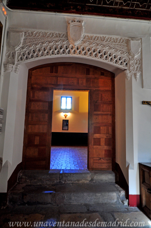 El acceso se hace a través de un arco carpanel, sobre el cual se dispone uno conopial11 que, a su vez, queda enmarcado por uno trilobulado14, todos ornamentados con motivos vegetales y animales. Dos pilastras rematadas con pináculos17, una a cada lado, flanquean la entrada.