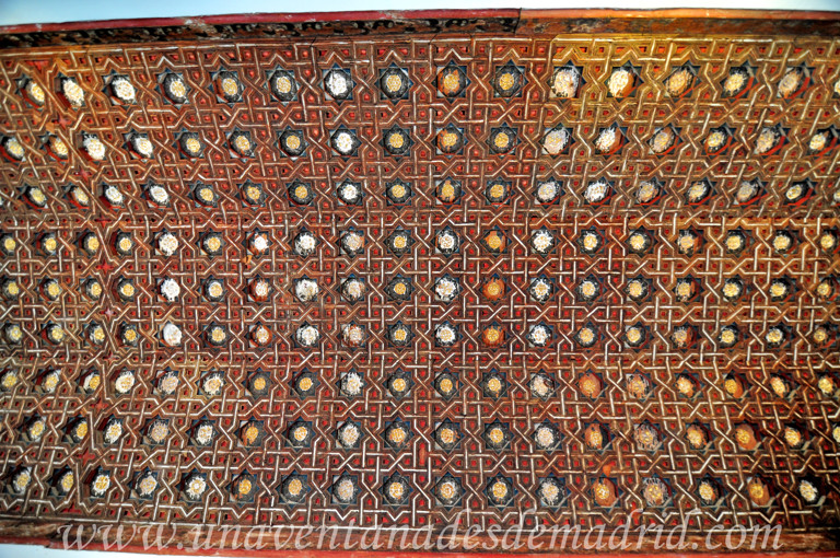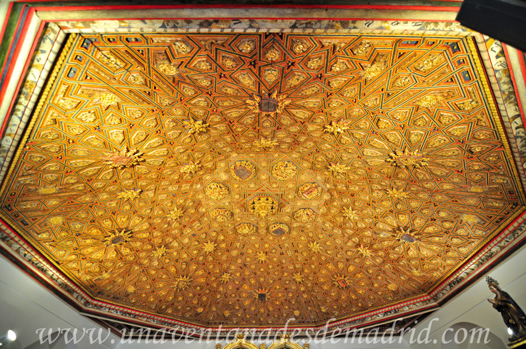 Pero sin duda lo que más llamará nuestra atención será la cubierta de madera dorada, con azul en los fondos y rojo en los cantos, en la que los lazos se van cruzando para formar geométricos octógonos en la parte central y hexágonos irregulares en los laterales. Un artesonado mudéjar que representa todo un homenaje al rey fundador Enrique IV y que podemos ver en la heráldica real flaqueada por los racimos de granadas y la presencia de este fruto en toda la techumbre, símbolo de la victoriosa campaña de Jimena llevada a cabo en plena toma de Granada. Por otro lado, esta obra tiene también una lectura espiritual: la techumbre, mirando al cielo, como la meta más alta a alcanzar; las estrellas de diez puntas, que forman otras de cinco, éstas como símbolo de la luz; los polígonos de ocho lados, como la Resurrección de Cristo, etc.