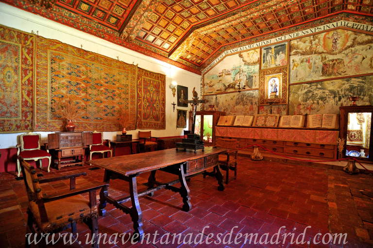 De planta más o menos cuadrada e iluminada por la luz que atraviesa una solitaria y sobria ventana, el mayor tesoro que aquí podremos contemplar será su techumbre, un alfarje jabalconado38 con cuatro tramos parecido a una cubierta de par y nudillo39 y en el que los paños inclinados tienen forma de taujel42. Decorado todo él con hojarascas ricamente policromadas, en el paño central encontraremos, de manera alterna, el escudo de Enrique IV y los símbolos franciscanos de las cinco llagas y la cruz leñosa, estando todo ello bordeado por el cordón de la orden.