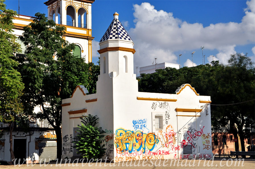 El edificio que mostramos en la fotografía adjunta es una antigua Caseta de Electricidad, de estilo neobarroco andaluz, construida por la Compañía Sevillana de Electricidad para el suministro eléctrico del Parque de Atracciones que fue levantado para la Exposición de 1929 y del cual, esta caseta, constituye el único recuerdo.