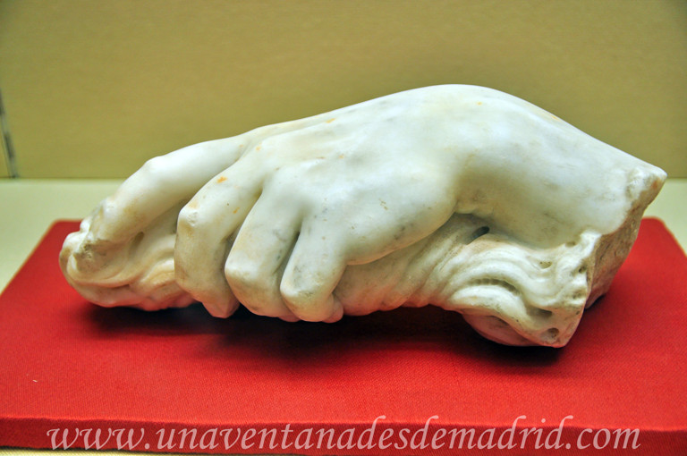 Tras ella, hay dos vitrinas. La primera está dedicada a las terracotas15, unas de las más importantes manifestaciones religiosas y artísticas dentro del mundo romano y el arte popular. Realizadas, generalmente, a molde, se pueden dividir en dos grupos: por un lado, las de pequeñas dimensiones, de las que tenemos aquí varios ejemplos de representaciones diversas; y por otro lado, las llamadas "antefijas", piezas realizadas para adornar las cubiertas de algunos edificios públicos, especialmente los templos, para los que se hacían imágenes religiosas (las que aquí vemos fueron halladas en la ciudad romana de Itálica (Sevilla)). En la otra vitrina, se exponen pequeñas esculturas realizadas en mármol; de ellas, podríamos destacar la que está en el centro: se trata de la mano de Júpiter (posiblemente de una figura de un emperador deificado16), que sostiene el "fulmen", el haz de rayos que simboliza su poder.