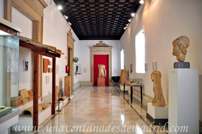 En el centro de la sala, en el suelo, tenemos un pavimento romano traído desde Itálica10 (Santiponce, Sevilla); éste fue realizado con la técnica llamada "opus sectile", consistente en la disposición de varios trozos de mármol de distintos colores que crean diferentes formas geométricas. En uno de sus laterales, hay una figura de una divinidad fluvial11 hecha en mármol gris oscuro que formó parte de una fuente decorativa; ésta aparece semidesnuda con un manto que le cubre sólo las piernas y está recostada sobre un ánfora de la que sólo ha llegado a nuestros días su arranque. Varios torsos o partes de esculturas de gran tamaño, y otras piezas de mármol completan la habitación.