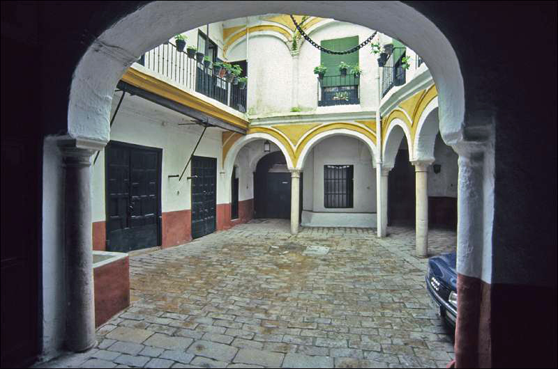 La antigua Posada del Lucero se halla, actualmente, encastrada y, por lo tanto, parcialmente oculta, en la manzana de edificios en que se levanta. A pesar del frente de edificios característico de las viviendas tradicionales sevillanas y las particularidades de la reformada fachada de la posada, tras esta última, encontramos una construcción del siglo XVII con la estructura característica adoptada por los mesones y las casas de postas54 a partir del siglo XVI. Un tipo éste de edificación en el que había dos zonas diferentes como son, por un lado, la que se levantaba alrededor del patio principal, situado en la parte delantera del edificio y con portada a la calle, y por otro, las caballerizas, ubicadas al fondo del inmueble.