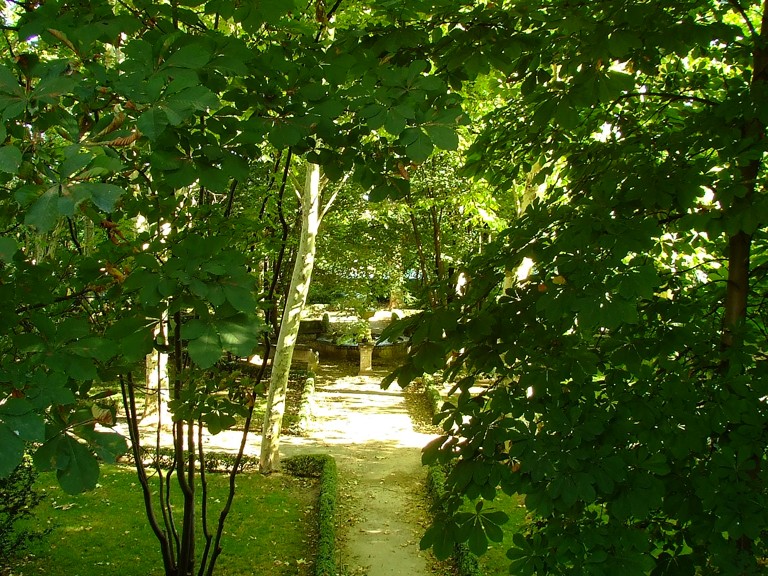 Entramos por esta antigua Portada Trasera y seguimos, en línea recta, el camino que en ella se inicia y que nos llevará hasta la Plaza de los Emperadores, que podemos considerar uno de los puntos de referencia del jardín.