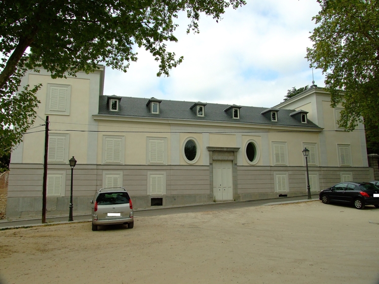 Si continuáramos por este camino, que es en realidad la continuación del que atraviesa el parque desde la entrada posterior y que hemos venido siguiendo mayoritariamente desde nuestra entrada al recinto, llegaríamos a la entrada principal del Palacio. Como la entrada está cerrada, deberemos dar la vuelta, salir por donde mismo hemos entrado y tomar el Paseo de la Alameda de Osuna hasta la Calle de la Rambla, donde acaba la tapia del parque. Subimos unos 150 metros por dicha calle y habremos llegado a la fachada principal del Palacio. Enfrente de éste, tenemos la Casa de Oficios.