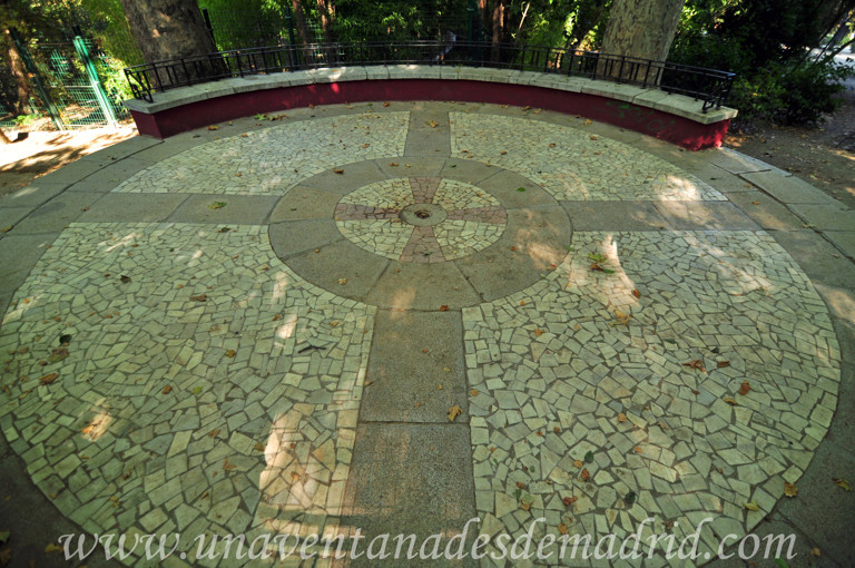 Situados junto a las anteriores esculturas, veremos muy cerca, al final del camino (hacia el Noroeste), la fuente de la glorieta de entrada. Desde ella, podemos bajar por el mismo camino hacia al Noreste, del que ya hablamos al principio cuando rodeamos el palacete, y seguirlo hasta llegar a la misma zona de escaleras que habíamos dejado a nuestra derecha y por las que ahora bajaremos. Por ellas, llegaremos hasta el mirador del Globo, desde el que obtendremos una amplia vista de la zona Este del parque.