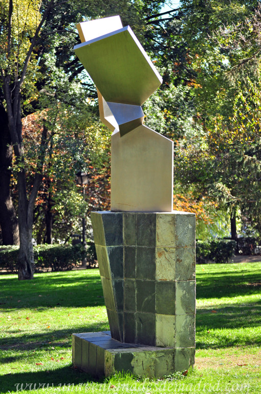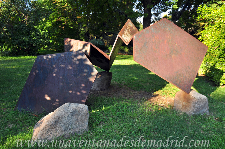 Tras el anterior muro de contención, el espacio verde allí existente, situado ya en el límite Sur del parque, debe entenderse más como una zona de separación de la Calle Sainz de Baranda y de su intenso tráfico. Si tomamos este camino para bordear por aquí el recinto, llegaremos hasta la Casa del Reloj. Mucho antes de llegar, habremos encontrado otro de los accesos al parque y un desvío hacia un camino paralelo al que estamos siguiendo, pero situado más hacia el interior de la finca. Entrando en este último y siguiéndolo, antes de llegar a su término en la fuente de la entrada principal, veremos dos esculturas abstractas, situadas una enfrente de la otra, a izquierda y derecha del camino.
