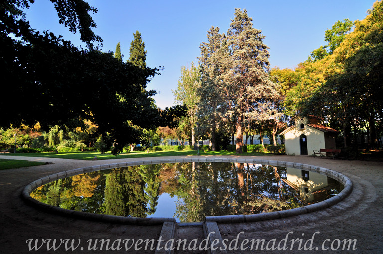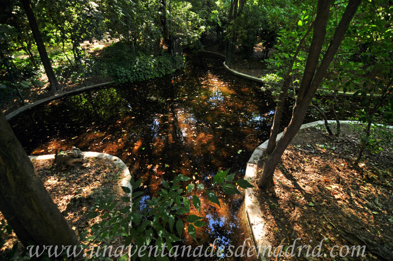 Una vez completada la que hemos llamado Senda del agua, nos trasladamos hasta la esquina Sureste del parque, una zona más densamente poblada de vegetación que la anterior del lago, en donde estuvo situado el antiguo invernadero y que se encuentra limitada por la Calle Alcalde Sainz de Baranda y la autovía M-30. Aquí, tras la reforma llevada a cabo entre los años 1948 y 1953, se instalaron dos fuentes unidas por un canal y separadas por una distancia de unos 50 metros entre sí. Algunas opiniones sostienen que, a pesar del indudable mérito de este espacio, su estilo, más cercano al que podría encontrarse en un jardín de tipo hispano-árabe, lo hace poco adecuado en el interior de un jardín paisajista como es éste.