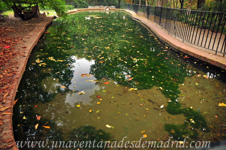 El siguiente elemento por el que pasaremos será, obviamente, el Estanque para Patos, alargado, con formas irregulares y unas dimensiones aproximadas de 30 metros de largo por 12 de ancho. Los bordes que lo delimitan son de ladrillo visto y en uno de sus laterales mayores, hay una zona de terrizo24, en donde se encuentra la caseta de las aves, una construcción formada por un tejado a dos aguas que sostienen cuatro pilastrillas25 de ladrillo.