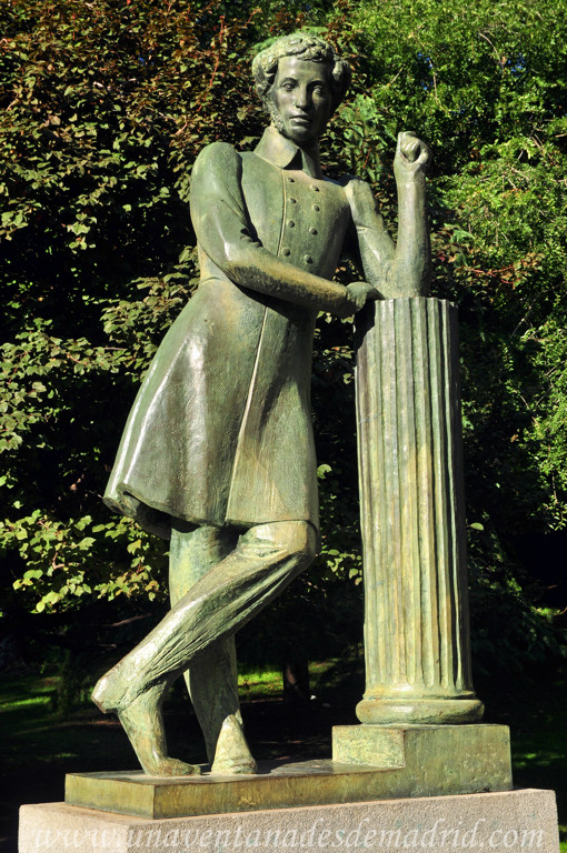 Siguiendo el camino que enmarca, por la izquierda, la anterior pradera y cogiendo la desviación por la que queda, a la derecha, un parque infantil, nos dirigiremos hacia el cenador que mostramos antes. Antes de llegar a éste, a la izquierda de la vía, tenemos la estatua de Alexandr Pushkin (Moscú, 1799 - San Petersburgo, 1837), el gran poeta ruso que, además de dramaturgo y novelista, fue considerado fundador de la moderna literatura rusa.
