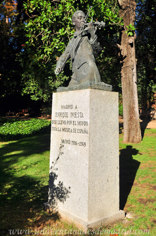 Si continuamos circunvalando la isla en dirección Oeste, dejando atrás y a nuestra derecha el Monumento a Bécquer, llegaremos hasta la Estatua de Enrique de Iniesta (Madrid, 1906 - Mendoza, Argentina, 1969), afamado violinista y profesor de virtuosismo37 en el Real Conservatorio Superior de Música de Madrid.