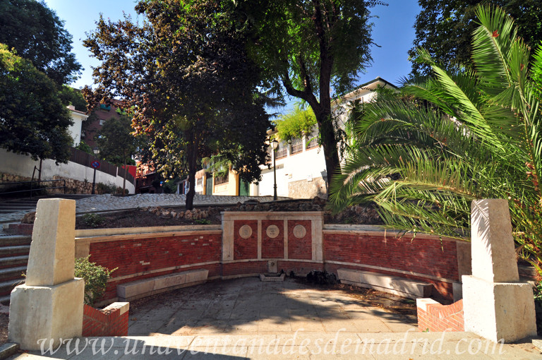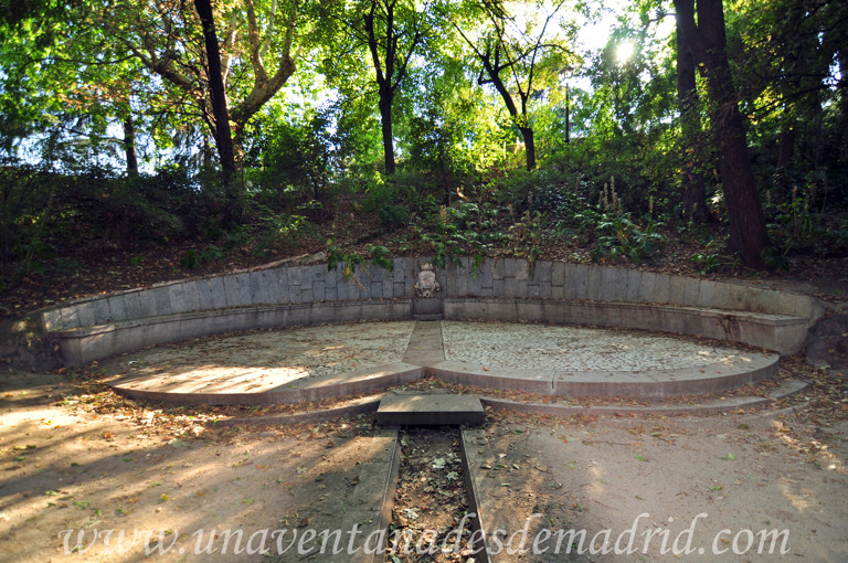 Seguimos el canal, penetrando más en la verde espesura, y llegamos hasta el lateral de una glorieta, donde hallamos una fuente mural con el Escudo de Madrid que guarda un cierto parecido con la ya vista Fuente del Berro. Al fondo, queda delimitada por un muro de contención de perfil elíptico, y al frente, por un doble seno31 de forma circular. Antes de que fuera cegada, contaba con dos surtidores de agua: uno, situado en el escudo-fuente que vemos al fondo en medio del muro; y otro, en una estatua de un dios-río con un cántaro del que brotaba el agua sobre el canal de comunicación con la otra fuente. La estatua ha sido retirada y guardada en un almacén municipal y su localización en la fuente la hallamos por la base cuadrada existente al final del canal, en el punto de unión de los dos arcos. Tras ella, y a su izquierda, existía un árbol cuyas ramas bajaban hasta la anterior estatua.