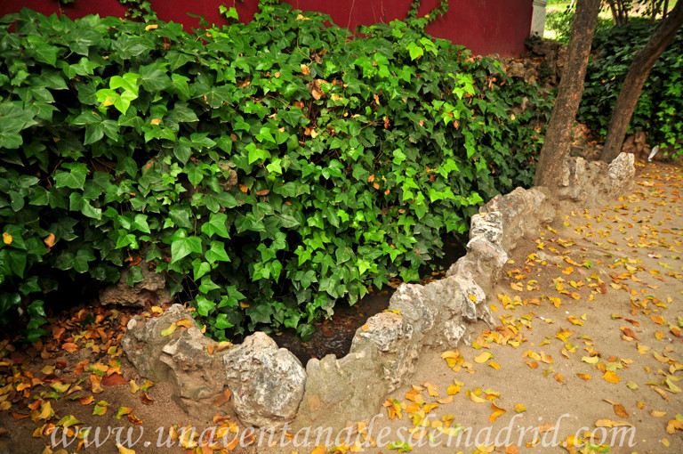 La fuente de la entrada sirve como eje central del Jardín de la Glorieta, al que delimitan a su vez los setos de aligustre15 dispuestos a su alrededor que realzan el carácter circular de lo que constituiría el jardín de entrada al interior de la quinta.