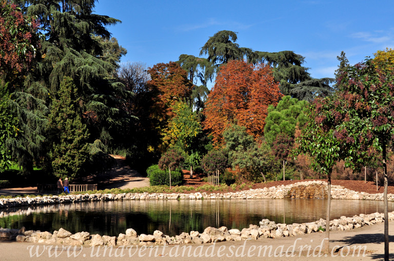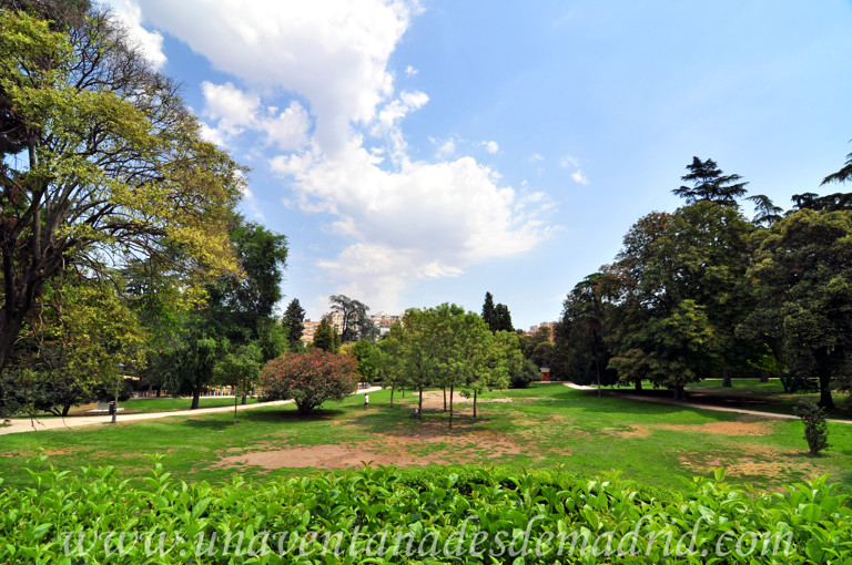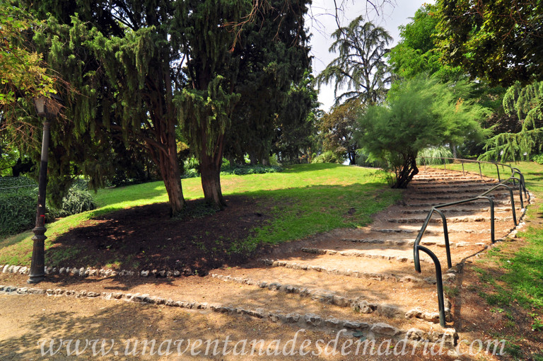 En esta parte es donde se encuentran los que podemos denominar como Jardines bajos, los cuales, en tiempos de la mencionada ría, tuvieron mejor aspecto. Y es que hay que tener presente que, además de todo el circuito de agua anterior, la finca tenía como límite en su lateral Este el cauce del arroyo Abroñigal , en la actualidad ocupado por la autovía M-30. Su construcción obligó a la instalación, a principios de los años 90 del pasado siglo XX, de pantallas acústicas que ayudaran a reducir la excesiva sonoridad que provocaba el enorme tráfico de esta vía de circunvalación. Por este mismo motivo, se plantó aquí un arboreto30 constituido por diversas especies vegetales frecuentes de ver en otros jardines madrileños como pueden ser, entre otras, las encinas y los pinos piñoneros, diferente vegetación y plantas aromáticas.