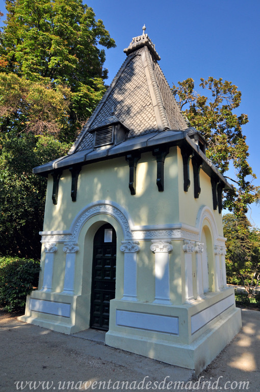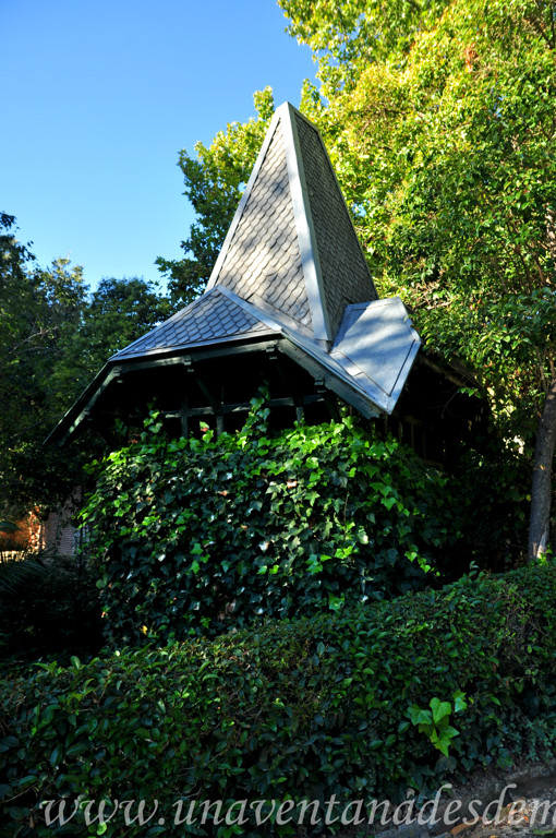 Una vez dejada atrás la Estatua de Iniesta y algo más adelante, el camino que rodea la ría chica se cruza con el que viene directamente desde la entrada de la Calle de los Peñascales; es en ese punto donde encontramos el siguiente lugar de interés. Se trata de un pabellón con formas típicas del siglo XIX y detalles historicistas41 en su fachada. Tanto éste como el quiosco42 cubierto parcialmente de vegetación que, tras acceder al parque por la recién mencionada entrada, vemos situado a su izquierda, nos pueden valer como hitos marcadores de sendos caminos por los que llegar hasta el Jardín Alto.