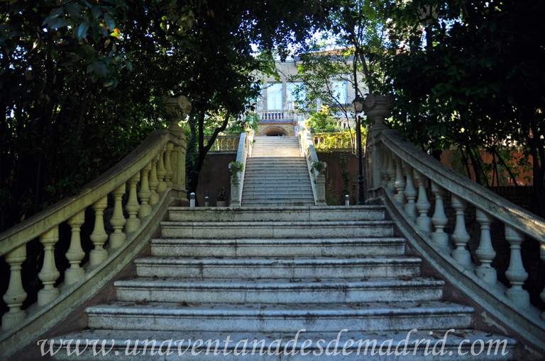 Si en vez de haber tomado el anterior desvío hubiéramos seguido el camino hacia adelante, siguiendo la trayectoria Noreste, Norte (en el punto situado junto a unas escaleras de descenso a las que regresaremos más adelante) y Noroeste, habríamos bordeado el palacio y llegado hasta su fachada Norte. Aunque el acceso está vallado en la actualidad (octubre de 2013), podemos divisar desde este punto la solemne escalera clásica que salva el gran desnivel existente desde la fuente circular hasta el palacio.