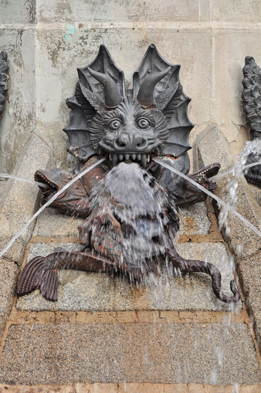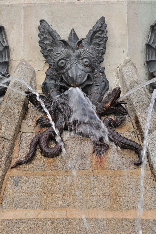 Así, de cada cara del pedestal brotan tres chorros de agua, uno procedente del diablo y dos de los animales por él sujetos, siendo éstos también diferentes en ambas carátulas. Los que mostramos a la izquierda son un lagarto y una serpiente, y los de la derecha, un delfín y otra serpiente.
