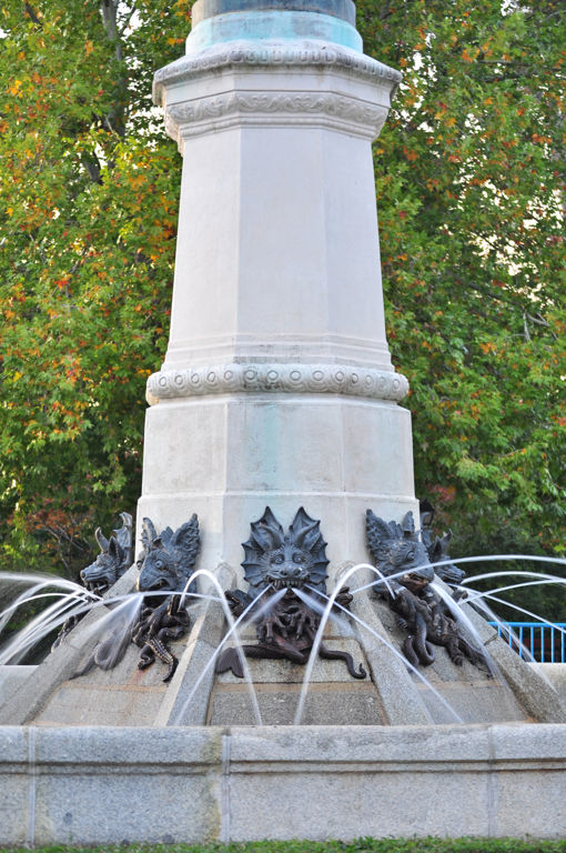 Las dos carátulas de demonios, o seres infernales, que aparecen alternándose en cada una de las ocho caras de que consta la pirámide constituyen los surtidores de la fuente.